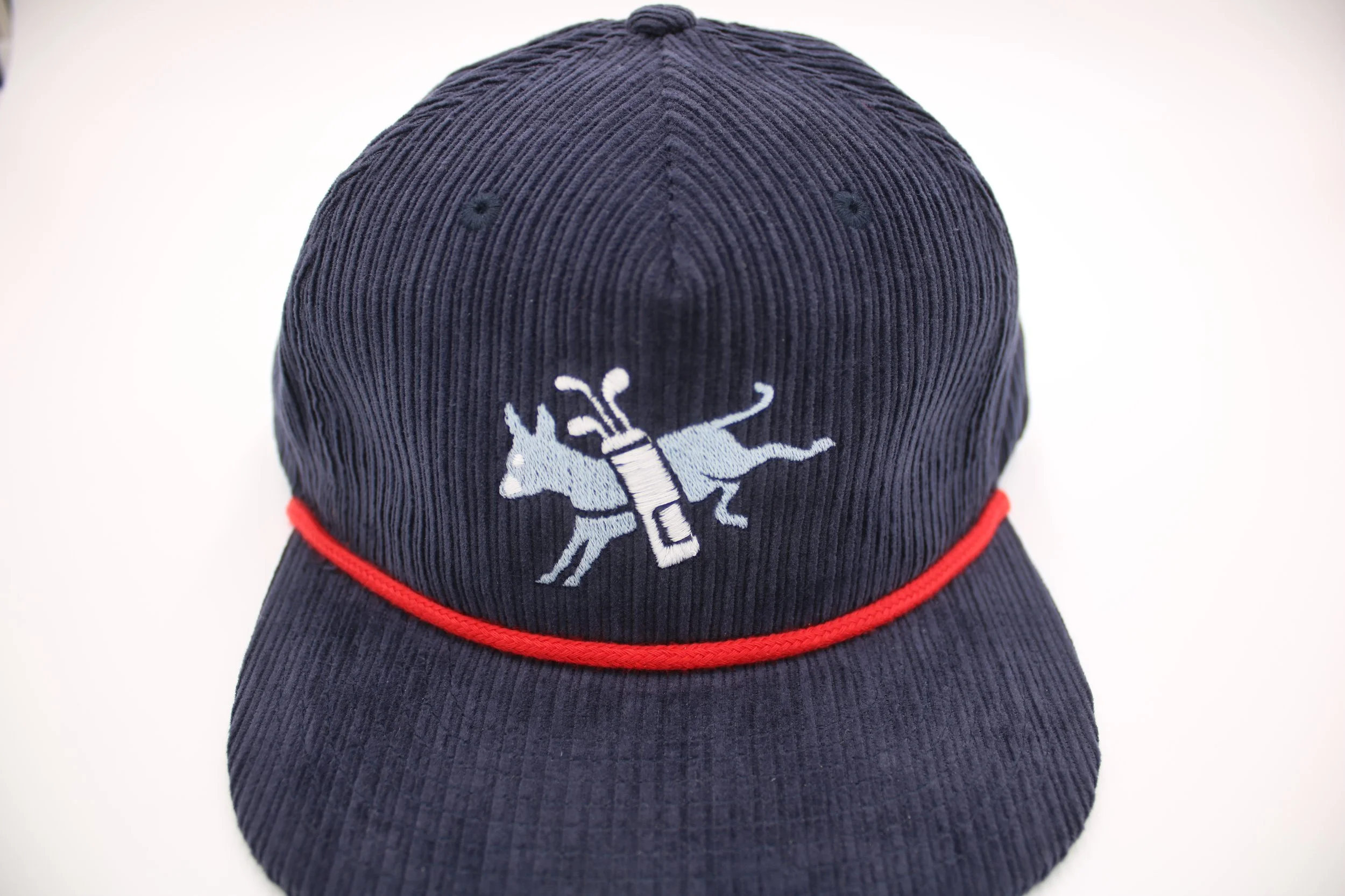 Our classic snapback corduroy hat, styled in a Navy colorway! This hat features a medium/high profile design and one size that fits most. The embroidered donkey logo adds a unique touch to the front, making it stand out from the crowd. Get yours today and elevate your hat game on the golf course!